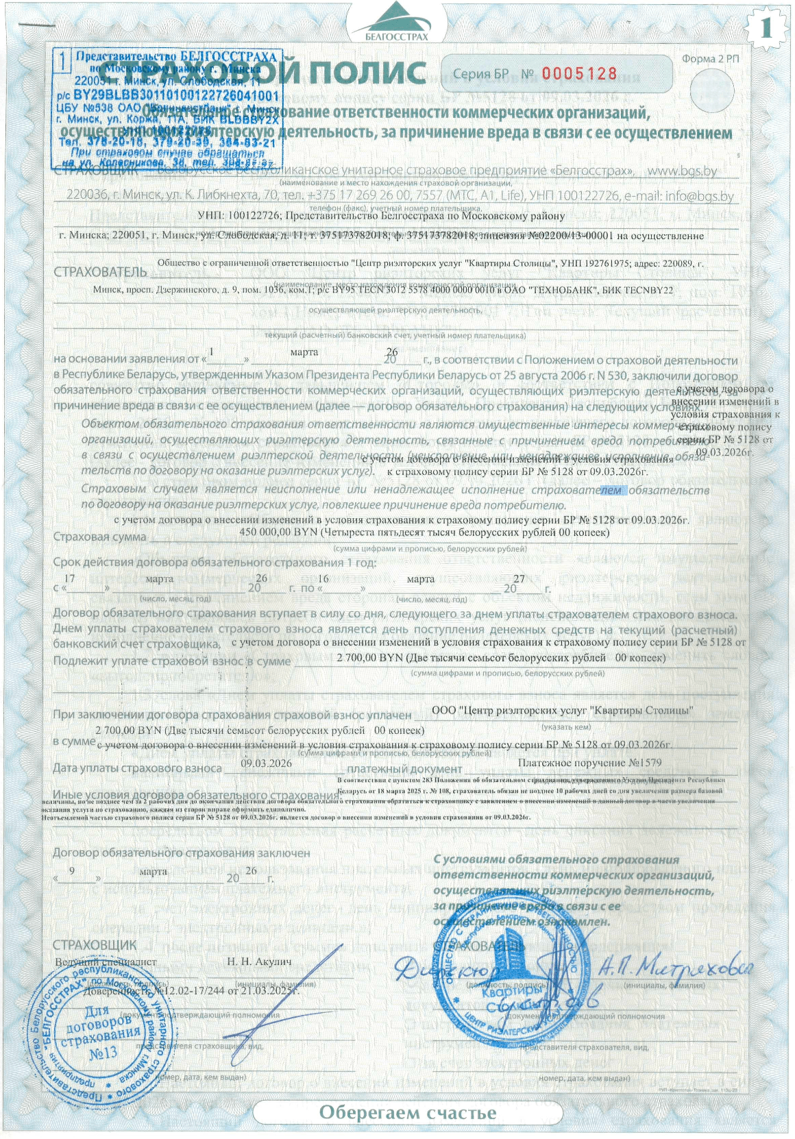 Мы страхуем свою ответственность перед клиентом по договору на оказание риэлтерских услуг на сумму 420 000 рублей, что гарантирует высокое качество услуг и законность сделки. Стоимость наших услуг регулируется постановлением Совета Министров Республики Беларусь от 1 ноября 2023г. №754.