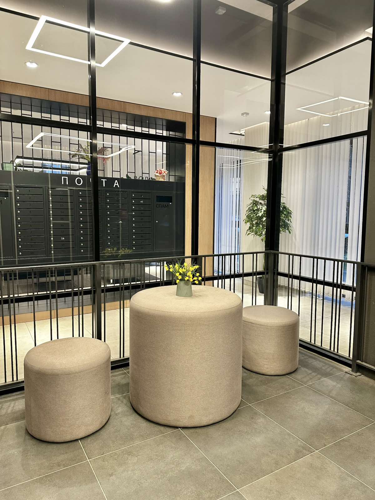Видеонаблюдение по периметру дома и в лифтах, на входе в подъезде консьерж, атмосферный холл для ожидания.