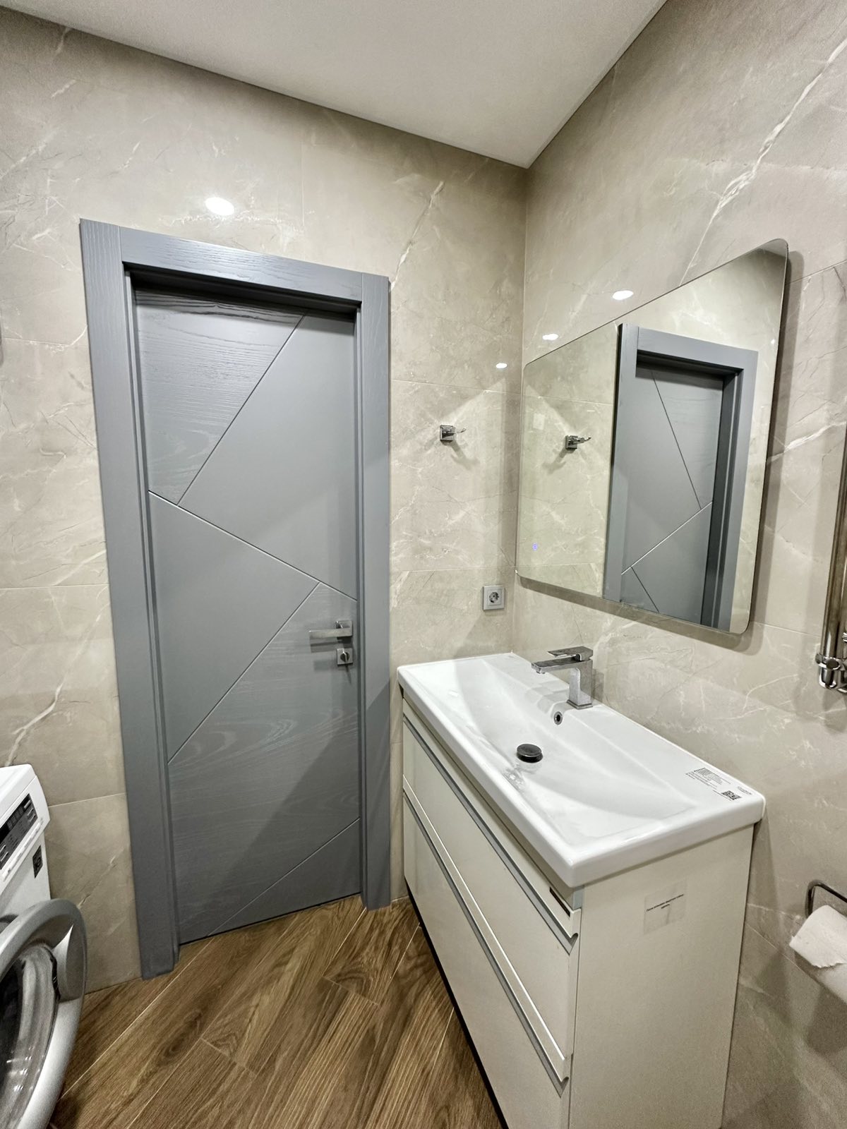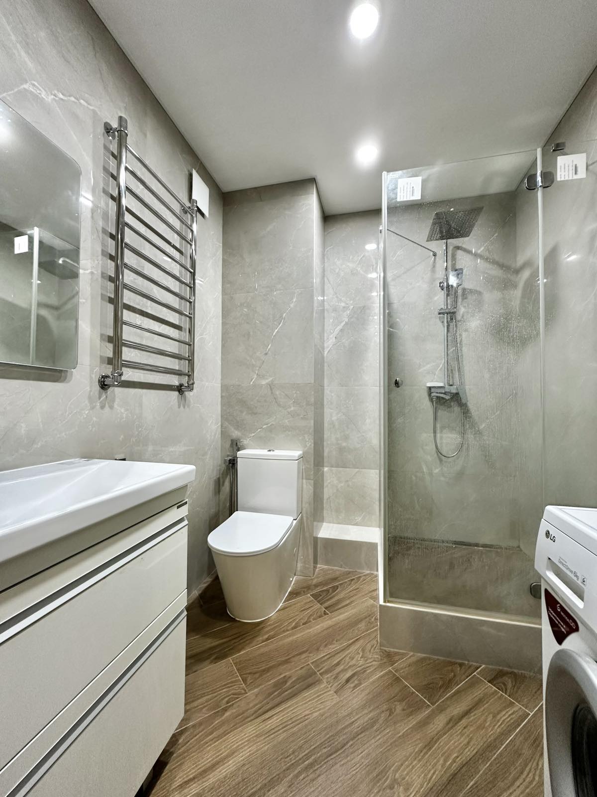 Потолки натяжные, высота 2,7 м. Напольное покрытие - ламинат и керамогранит. Стены – обои. Большой сан.узел с ванной.
