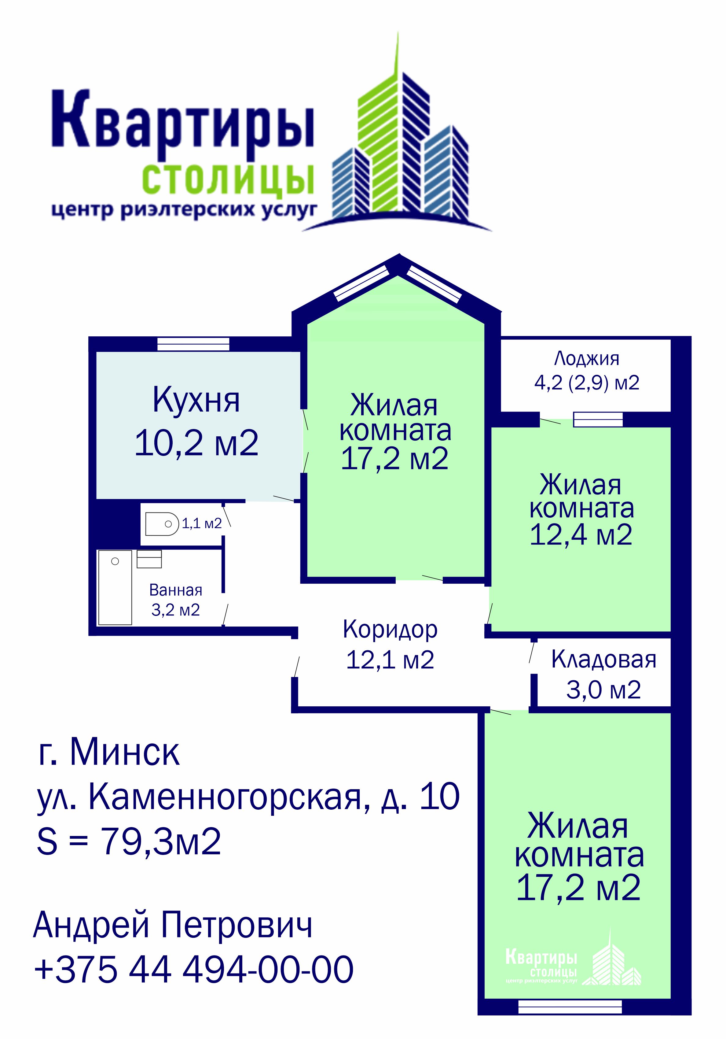 Три раздельные комнаты: 17,2 м2, 12,4 м2, 17,2 м2. Кухня: 10,2 м2.