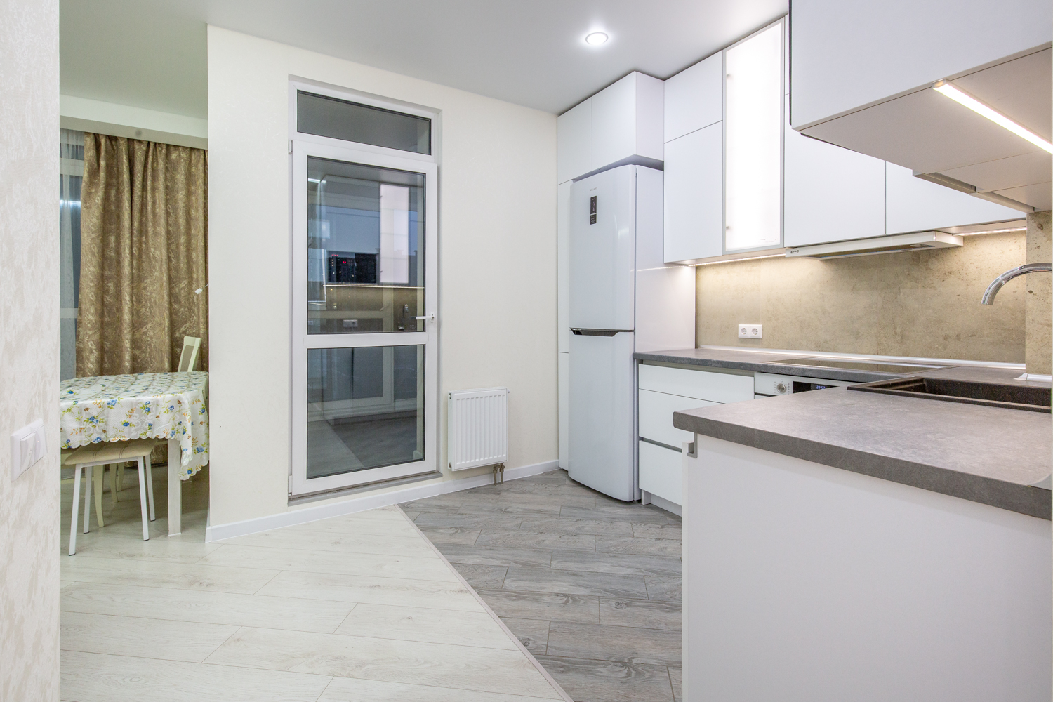 Кухня-гостиная: визуально разделена на рабочую зону и зону для отдыха. На кухне есть всё необходимое для вашего комфорта: встроенная мебель и встроенная необходимая техника. Из зоны кухни имеется выход на лоджию.