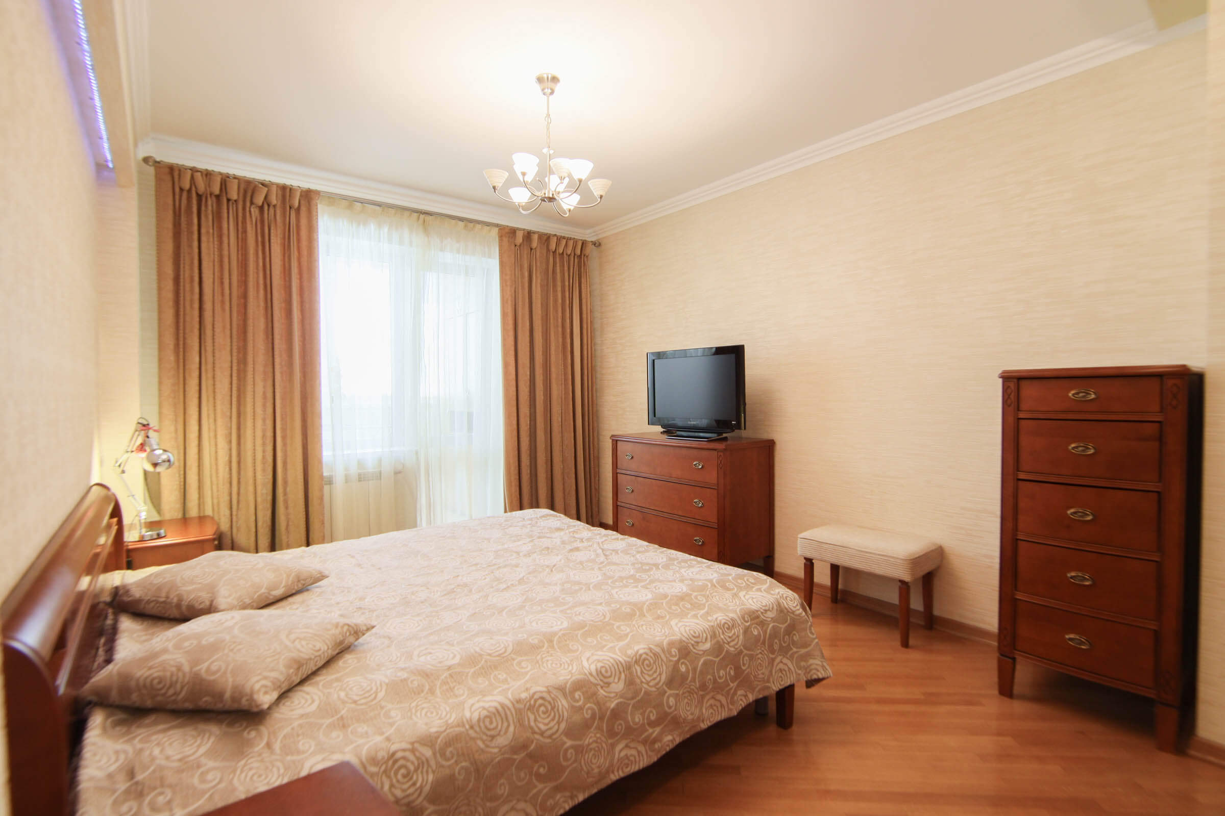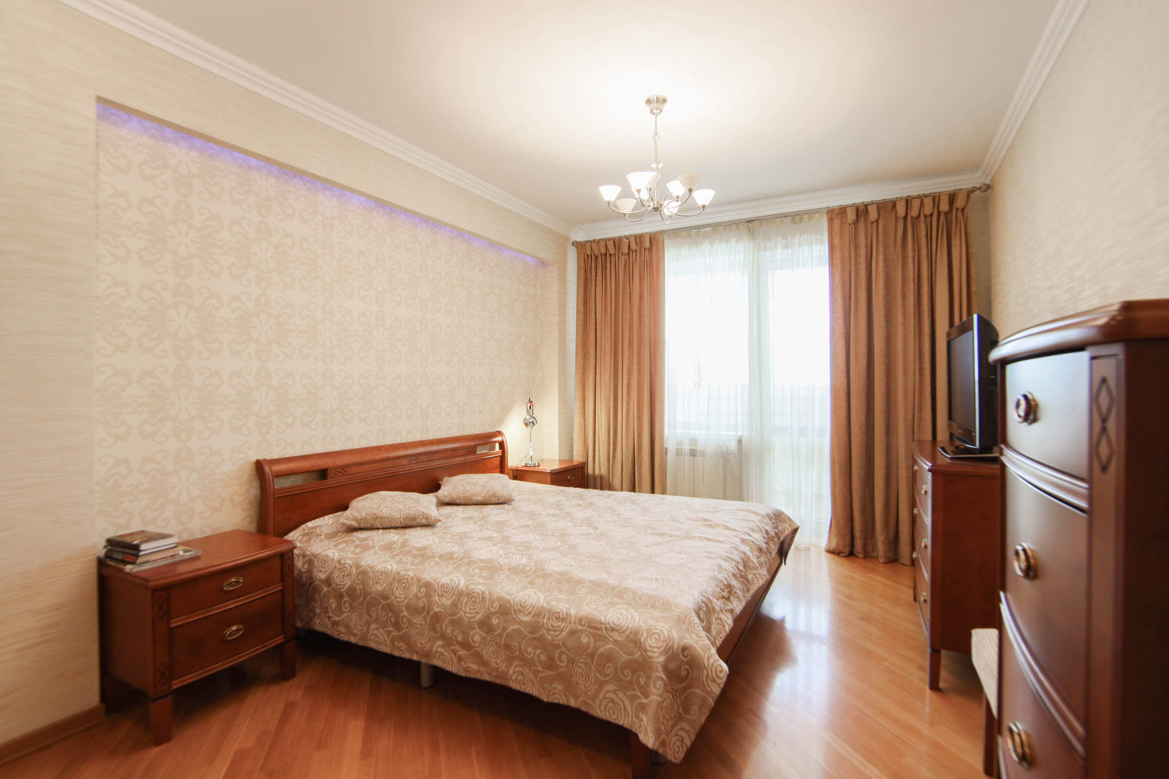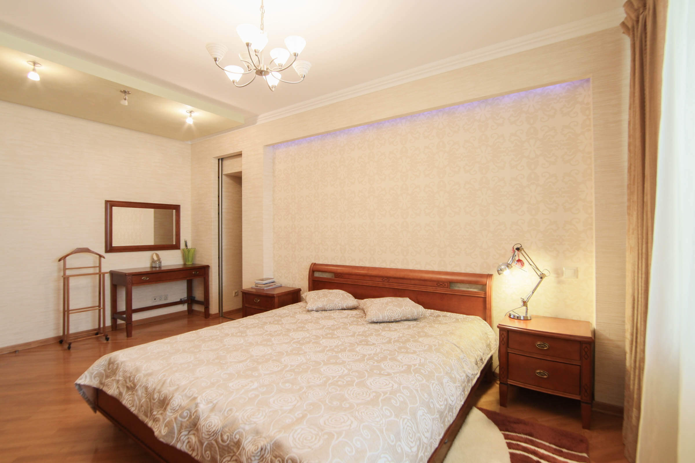 Спальня площадью 16.4 м2 со своей гардеробной площадью 1.4м2. Имеется несколько зон подсветки, потолок гипсокартон, на полу паркет, на стенах обои. Вся мебель из массива. Имеется выход на одну из лоджий.