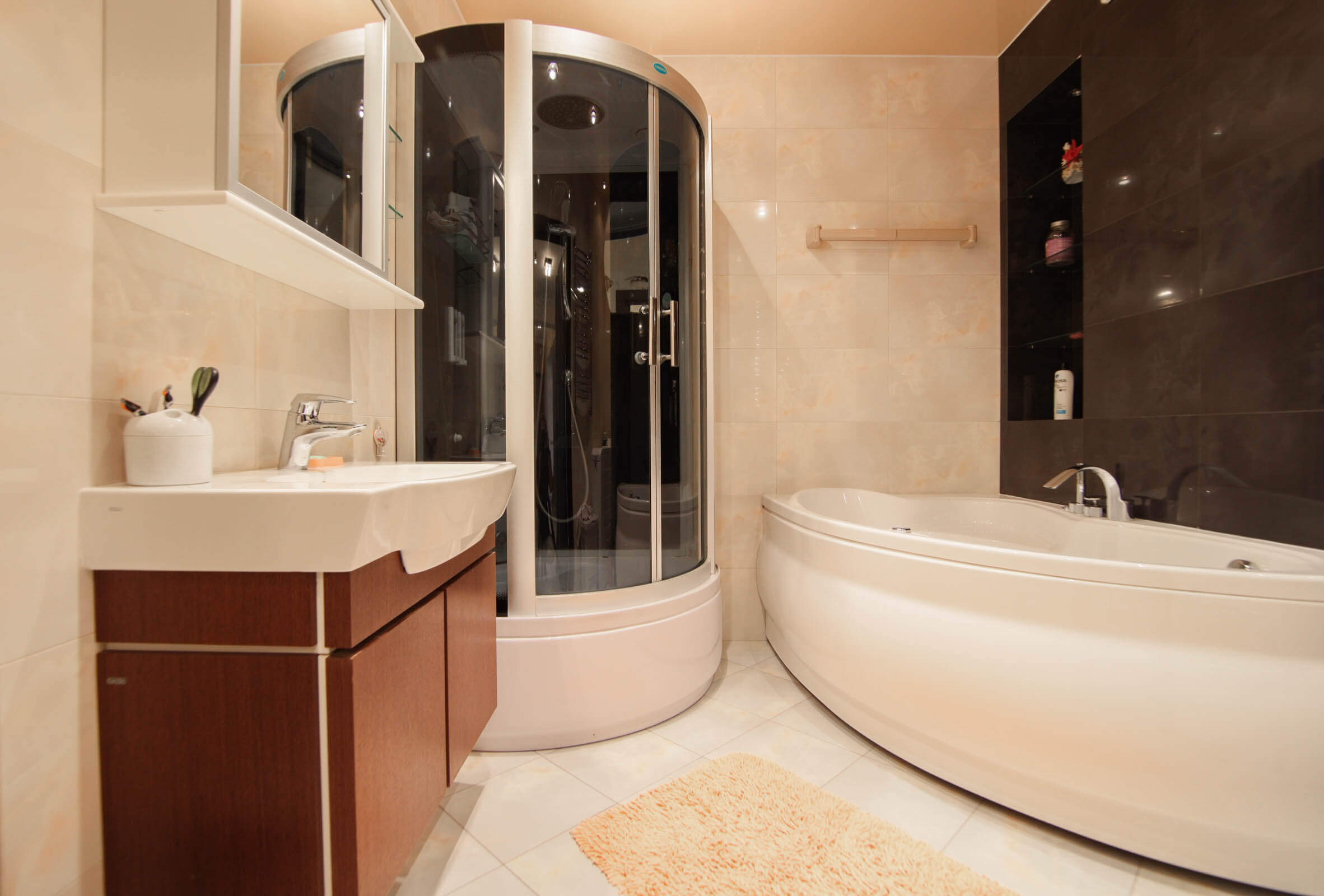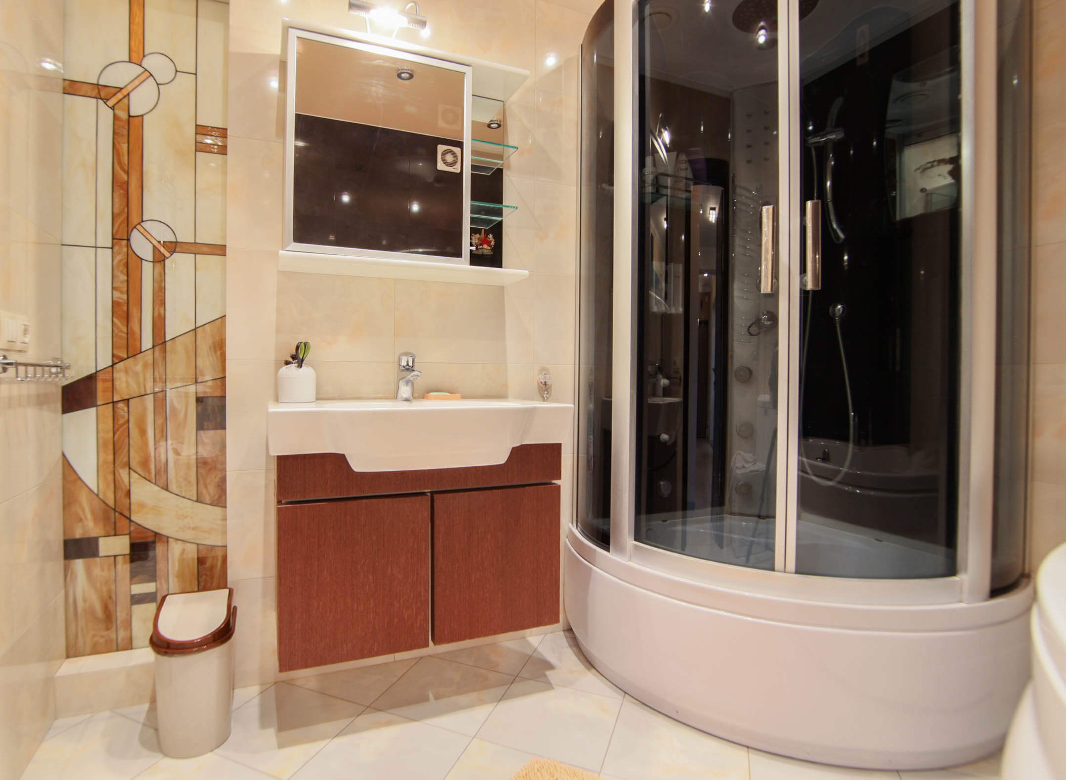 Ванна площадью 5.9 м2, полностью в плитке. Установлена полноразмерная угловая ванная и душевая кабина – у хозяев всегда будет выбор.