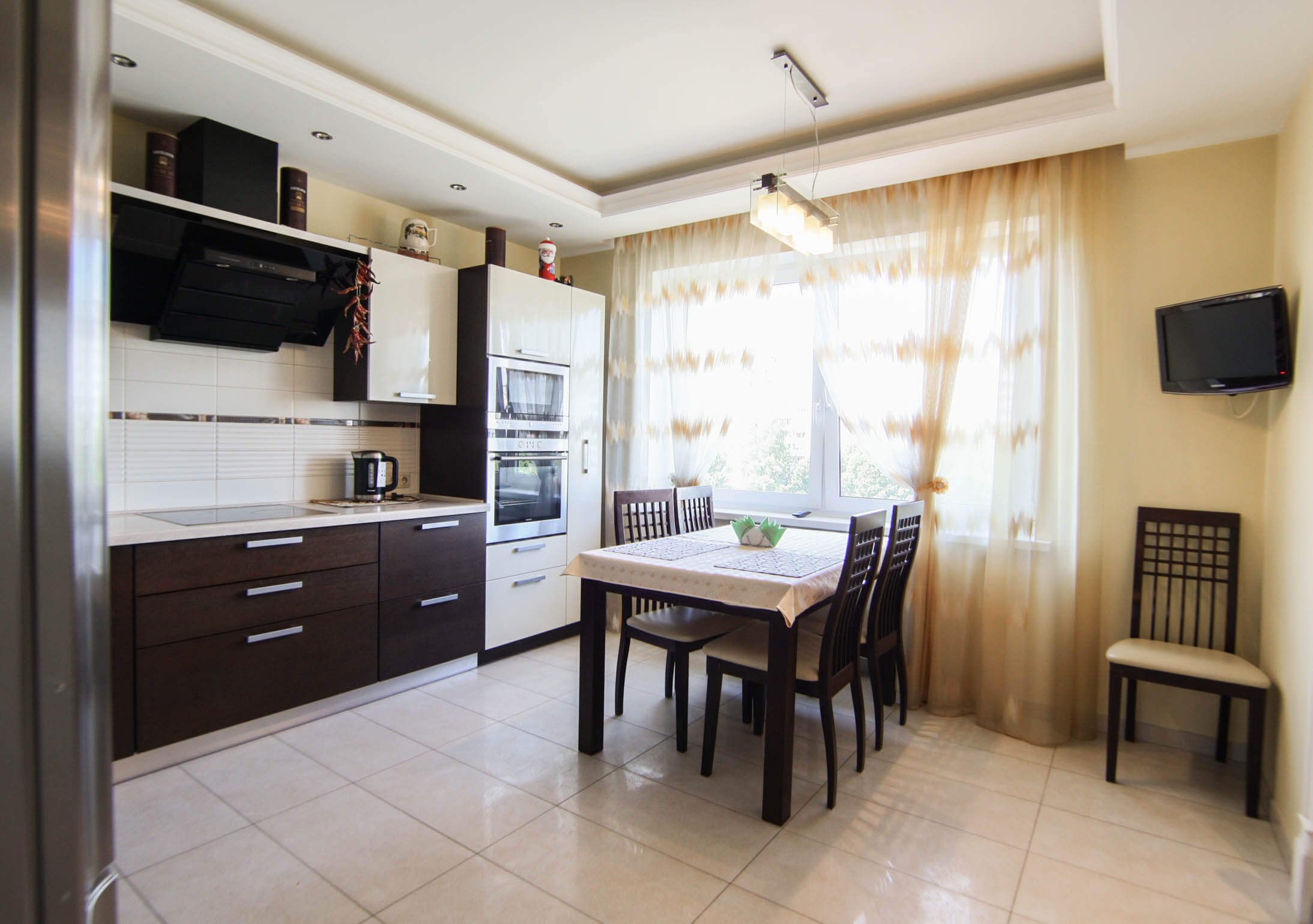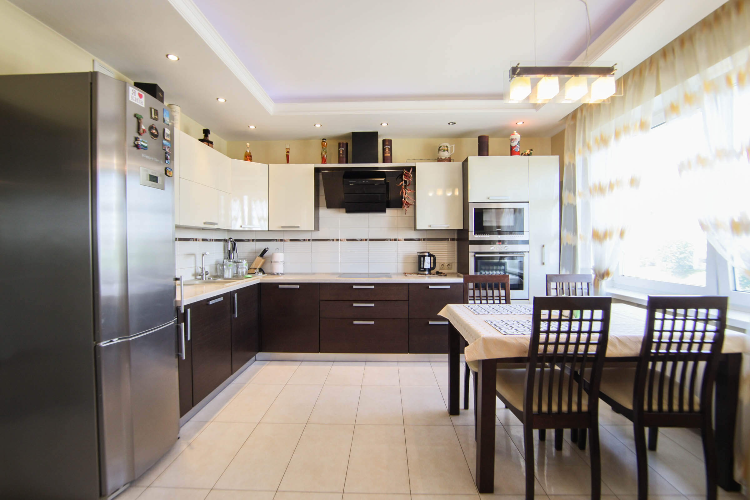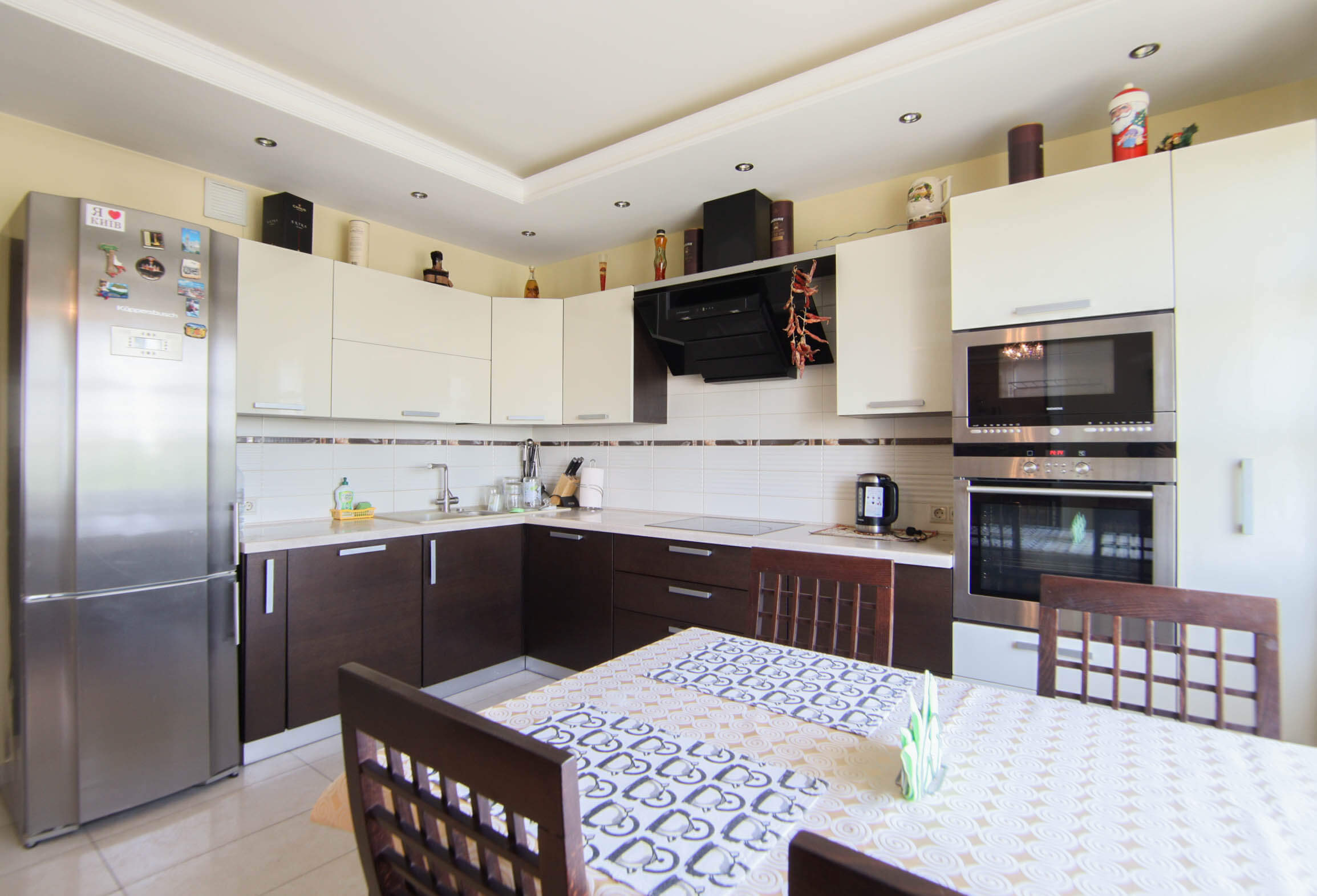Кухня общей площадью 15.6 м2. Полностью укомплектована от посудомойки до необходимых мелочей. На полу плитка. Встроенная бытовая техника. Визуально разделены зоны на рабочую для готовки и столовую, для посиделок с друзьями или семьей.