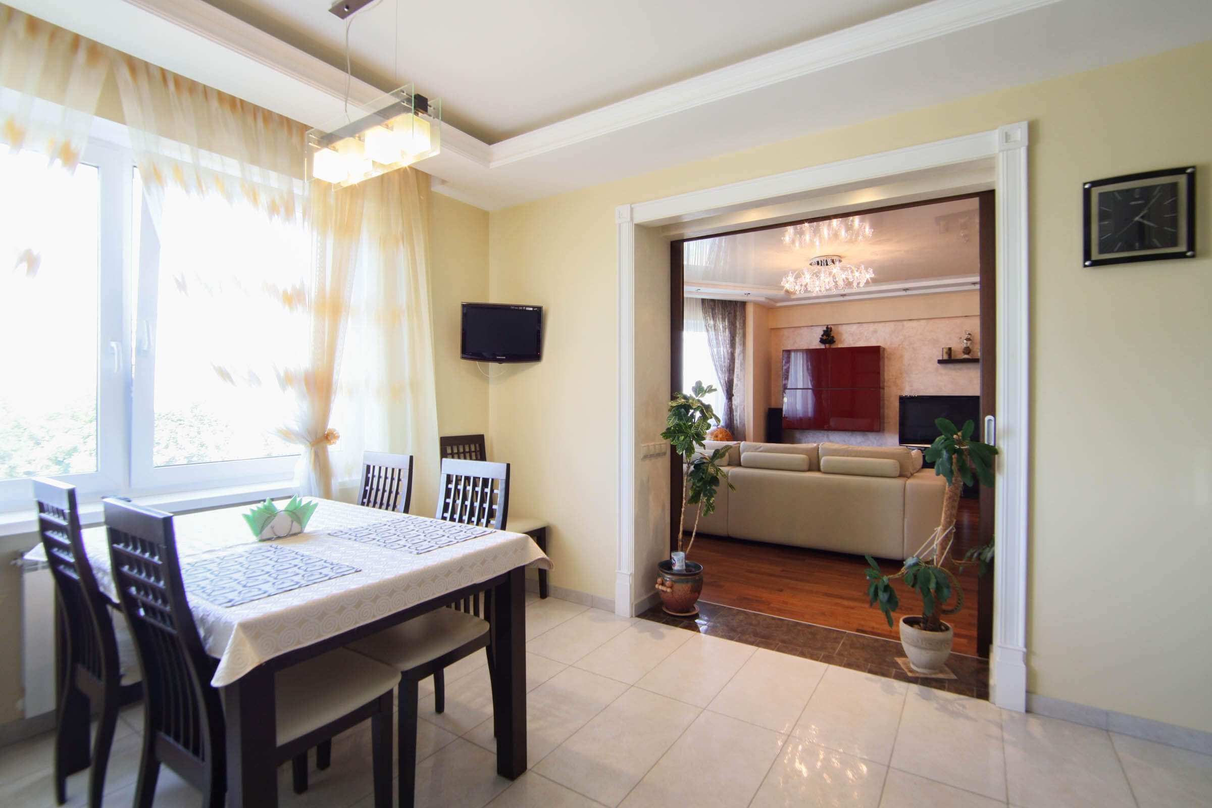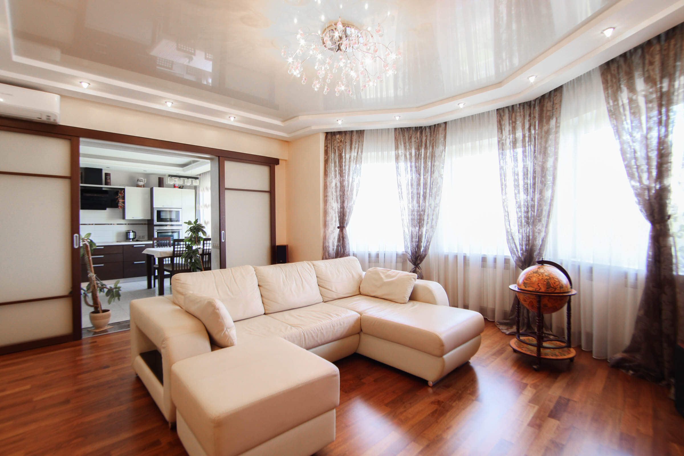 Гостиная: отделена от кухни раздвижной дверью.Общей площадью 24.4 м2. Благодаря эркерным окнам в гостиной всегда светло и уютно. Установлен кожаный диван и ТВ зона для отдыха. Идеальное место для проведения семейных вечеров.