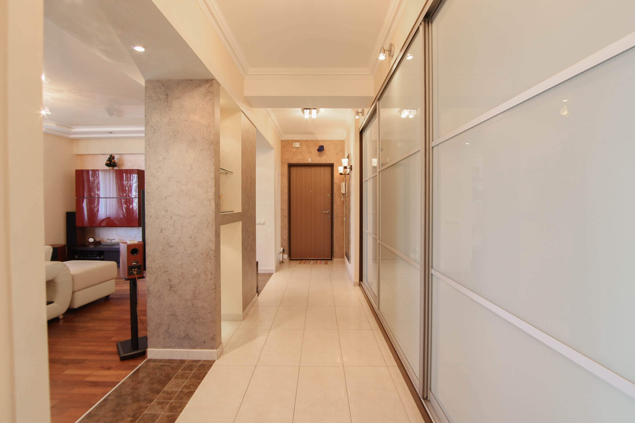 Прихожая и коридор: площадью 14.5м2. Входная металлическая дверь, полноразмерные шкафы на заказ, которые сохранят всё необходимое, включая инвентарь для уборки.
